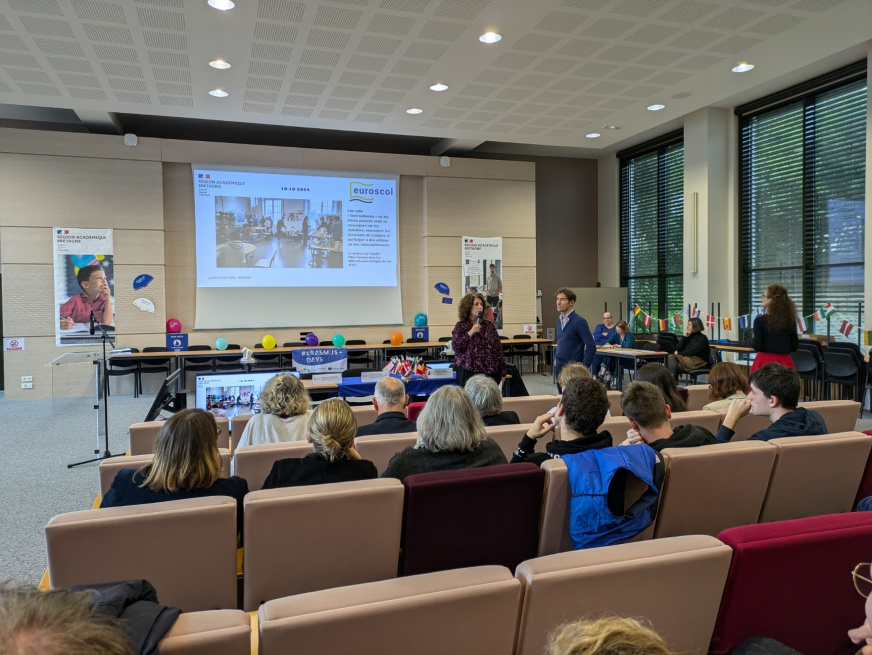 Dans le cadre de sa politique d’ouverture internationale, le lycée Zola a obtenu le label EUROSCOL pour les trois années à venir (2024-2027). Lors de la cérémonie de remise des certificats au Rectorat de la Région académique de Bretagne, Mme Kerdranvat et M. Josse, Enseignants Référents pour l’Action Européenne et Internationale (ERAI) pour l’année 2023-2024, ont présenté le projet « international » du lycée avant de recevoir l’attestation des mains de M. Le Recteur